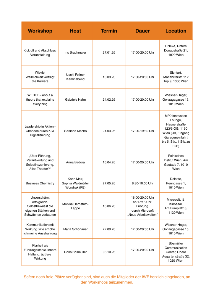Neben dem persönlichen und vertraulichen Austausch mit der Mentorin wird IWF Austria Mentoring 2026 mit einem attraktiven Rahmenprogramm abgerundet. In exklusiven Workshops werden zu ausgewählten Themen spannende Inhalte und ein offener Erfahrungsaustausch angeboten. Die Teilnahme ermöglicht auch das große Netzwerk des IWF Austria kennenzulernen. Hier geht’s zum Programm.